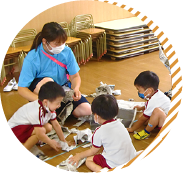 毎日子ども達ひとりひとりと向き合っていて大変だと思うこともありますが、日々の子どもたちの成長を近くで見ることができるのは担任として喜びでありとてもやりがいがあります。ピアノが苦手で弾けるまで時間がかかりますが、他の先生と練習し合ったり、わからないところは聞きながら助け合うことで行事などを乗り越えています。放課後は、毎日の保育を学年で振り返ったり、製作物や保育活動の準備をしています。